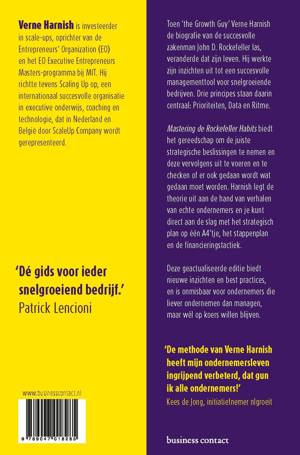 Mastering de Rockefeller Habits biedt het gereedschap om de juiste strategische beslissingen te nemen en deze vervolgens uit te voeren en te checken of er ook gedaan wordt wat gedaan moet worden. Harnish legt de theorie uit aan de hand van verhalen van echte ondernemers en je kunt direct aan de slag met het strategisch plan op één A4tje, het stappenplan en de financieringstactiek.