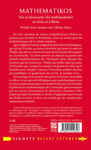 Precede d'un entretien avec Olivier PeyonEn une centaine de textes, d'Apollonius a Theon en passant par Euclide et Ptolemee, vous ne verrez plus les mathematiques de la meme maniere. Qui a deja lu l'enonce original du theoreme de Pythagore, qui sait qu'il existe un autre theoreme qui porte le nom de Thales, qui sait ou trouver les anecdotes les plus fantasques sur Archimede ? Ce livre permet de donner la parole aux grands mathematiciens de l'Antiquite pour dissiper les mysteres qui les entourent: Thales qui tombe dans un puits, Archimede qui compte le nombre de grains de sable qu'il faudrait pour remplir l'univers, l'invention oubliee du zero par Jamblique, la quadrature du cercle, le nombre d'or...Cet ouvrage est le premier du genre en France. Accessible a celles et ceux qui sont allergiques aux mathematiques tout en etant passionnant pour les mathematiciens chevronnes, il presente les mathematiques de l'Antiquite greco-romaine par ses textes, permettant de decouvrir comment elles etaient pensees, formulees et revees. S'appuyant sur le fonds des Belles Lettres, le livre est enrichi par de nombreuses traductions inedites.