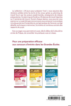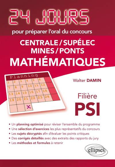 Les ouvrages de la collection 24 jours permettent d’optimiser son travail durant les 2 années de classes préparatoires aux Grandes Écoles. Grâce au planning de travail fourni par les auteurs expérimentés, enseignants de classes préparatoire, ce ouvrage assurera aux étudiants en filière PSI des révisions solides en mathématiques entre les écrits et les oraux des concours Centrale/Supélec/Mines/Ponts.