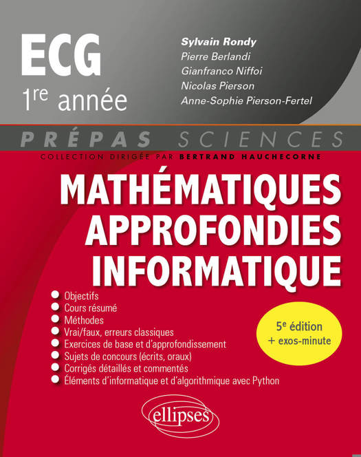 La 5e édition de cet ouvrage a pour objectifs de permettre aux étudiants en prépas ECG 1re année de réviser leur cours de Mathématiques approfondies - Informatique et de l'assimiler par la mise en application des notions. Dans chaque chapitre, correspondant à peu près à une semaine de cours, le lecteur trouvera notamment :