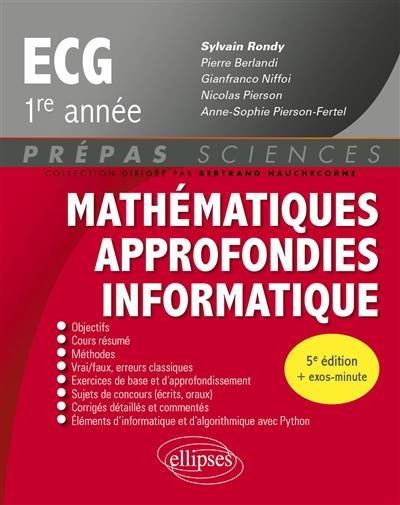 La 5e édition de cet ouvrage a pour objectifs de permettre aux étudiants en prépas ECG 1re année de réviser leur cours de Mathématiques approfondies - Informatique et de l'assimiler par la mise en application des notions. Dans chaque chapitre, correspondant à peu près à une semaine de cours, le lecteur trouvera notamment :