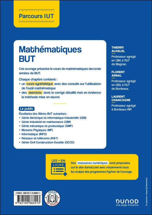 Cet ouvrage de la collection "Parcours IUT" présente le cours de mathématiques des trois années de BUT des filières GEII, GIM, GMP, Mesures physiques, Informatique, Réseaux et télécommunications. Les rappels de cours sont appuyés par de nombreux exercices corrigés. Le cours est structuré en courtes sections. Chaque section contient : - un cours synthétique avec des conseils sur l'utilisation de l'outil mathématique ; - des exercices dont le corrigé détaillé met en évidence la méthode mise en œuvre.