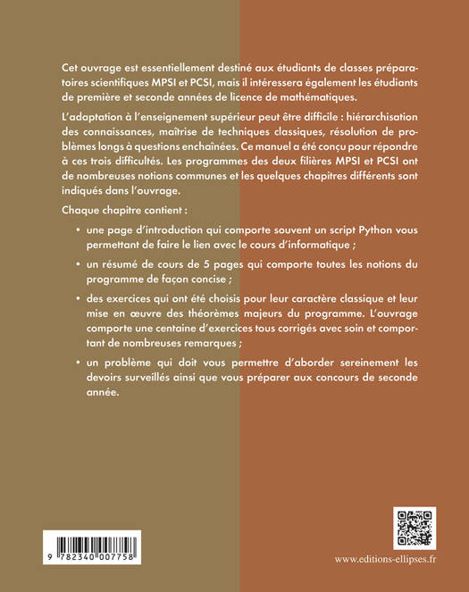 Cet ouvrage est essentiellement destiné aux étudiants de classes préparatoires scientifiques MPSI et PCSI, mais il intéressera également les étudiants de première et seconde années de licence de mathématiques.