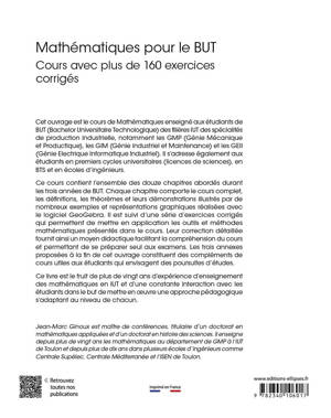 Ce cours contient l’ensemble des douze chapitres abordés durant les trois années de BUT. Chaque chapitre comporte le cours complet, les définitions, les théorèmes et leurs démonstrations illustrés par de nombreux exemples et représentations graphiques réalisées avec le logiciel GeoGebra.