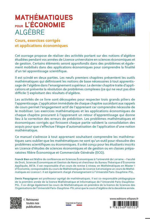 Cet ouvrage propose de réaliser des activités portant sur des notions d’algèbre étudiées en Licence universitaire en sciences économiques et de gestion. Certains éléments seront approfondis dans des problèmes et également mobilisés dans des applications économiques pour comprendre la finalité d’un tel apprentissage scientifique. Il est scindé en deux parties :