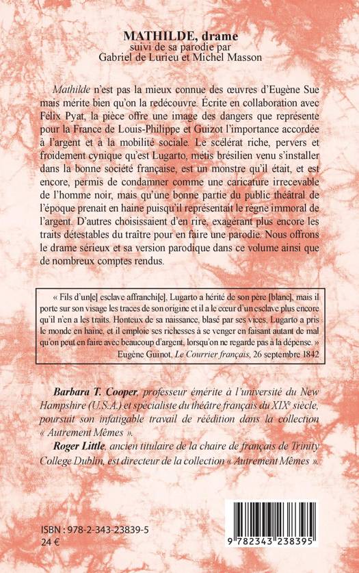 Mathilde n'est pas la mieux connue des oeuvres d'Eugène Sue mais mérite bien qu'on la redécouvre. Écrite en collaboration avec Félix Pyat, la pièce offre une image des dangers que représente pour la France de Louis-Philippe et Guizot l'importance accordée à l'argent et à la mobilité sociale. Le scélérat riche, pervers et froidement cynique qu'est Lugarto, métis brésilien venu s'installer dans la bonne société française, est un monstre qu'il était, et est encore, permis de condamner comme une caricature irrecevable de l'homme noir, mais qu'une bonne partie du public théâtral de l'époque prenait en haine puisqu'il représentait le règne immoral de l'argent. D'autres choisissaient d'en rire, exagérant plus encore les traits détestables du traître pour en faire une parodie. Nous offrons le drame sérieux et sa version parodique dans ce volume ainsi que de nombreux comptes rendus.