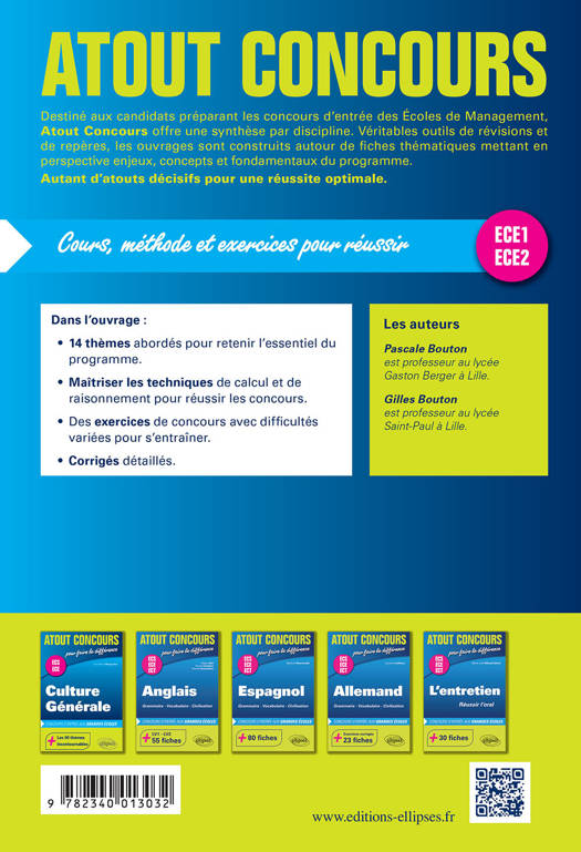 Destiné aux candidats préparant les concours d’entrée des Écoles de Management, Atout Concours offre une synthèse par discipline. Véritables outils de révisions et de repères, les ouvrages sont construits autour de fiches thématiques mettant en perspective enjeux, concepts et fondamentaux du programme.