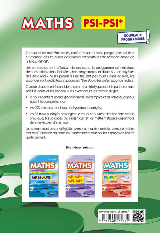 Ce manuel de Mathématiques, conforme au nouveau programme, est écrit à l’intention des étudiants des classes préparatoires de seconde année de la filière PSI/PSI*.