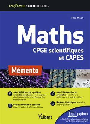 En plus de 50 fiches, ce Mémento de maths revient sur l’ensemble des principes mathématiques souvent appris de manière isolée pour les mettre en lien les uns avec les autres : c’est l’esprit prépa attendu aux oraux et écrits des concours les plus importants (CCP, Centrale-Supelec, Mines-Pont, ENS) et difficilement maîtrisé par les élèves en classes préparatoires scientifiques.