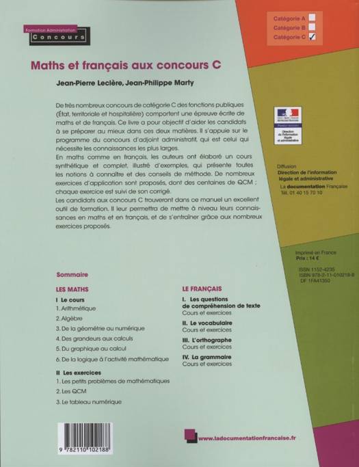 De très nombreux concours de catégorie C des fonctions publiques (État, territoriale et hospitalière) comportent une épreuve écrite de maths et de français. Ce livre a pour objectif d'aider les candidats à se préparer au mieux dans ces deux matières. Il s'appuie sur le programme du concours d'adjoint administratif, qui est celui qui nécessite les connaissances les plus larges.