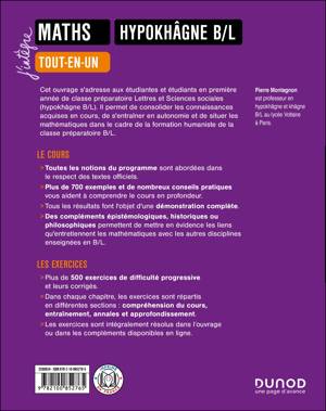 Cet ouvrage s'adresse aux étudiantes et aux étudiants en première année de classes préparatoires Lettres et Sciences sociales (hypokhâgne B/L). Il permet de consolider les connaissances acquises en cours, de s'entraîner en autonomie et de situer les mathématiques dans le cadre de la formation humaniste de la classe préparatoire B/L.