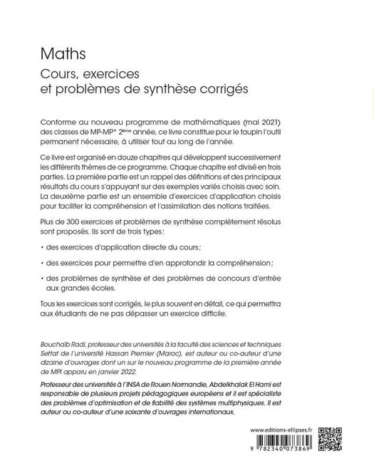 Chaque chapitre est divisé en trois parties : un rappel des définitions et des principaux résultats du cours qui s’appuient sur des exemples ; un ensemble d’exercices d’application et de problèmes de synthèse et de concours ; et enfin, l’ensemble des corrigés détaillés.