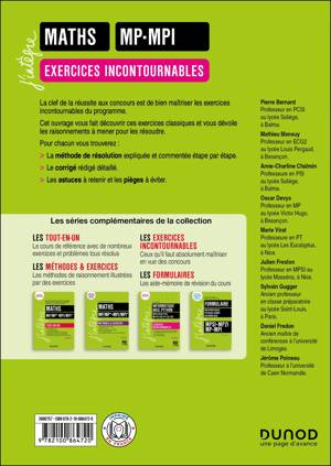 Vous avez besoin d’accompagnement pour appliquer votre cours de mathématiques du programme de MP ou MPI ? Vous voulez être à l’aise face à tout exercice ? La clef de la réussite est de bien maîtriser les exercicesincontournables du programme. Cet ouvrage vous fait découvrir ces exercices et vous dévoile leurs méthodes de résolution. Pour chaque exercice, vous trouverez : • La méthode de résolution expliquée et commentée étape par étape. • Le corrigé détaillé rédigé. • Les astuces à retenir et les pièges à éviter.