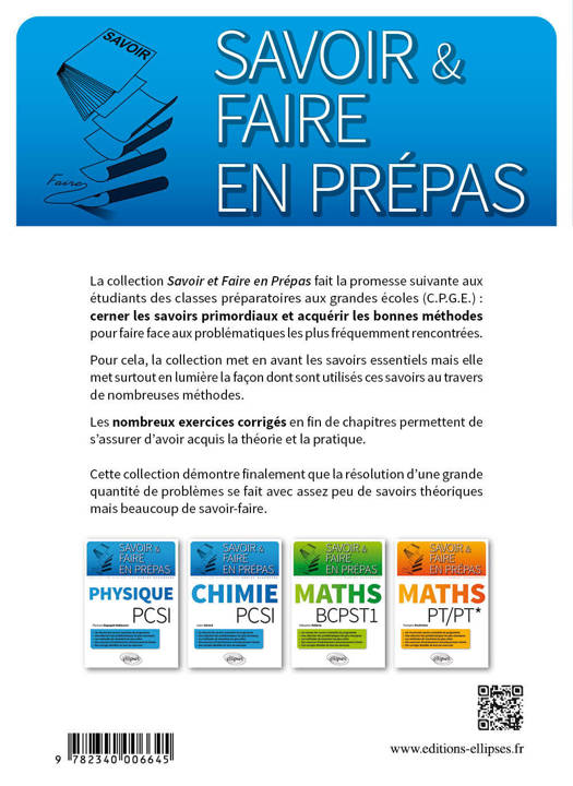 La collection Savoir et Faire en Prépas fait la promesse suivante aux étudiants des classes préparatoires aux grandes écoles (C.P.G.E.) : cerner les savoirs primordiaux et acquérir les bonnes méthodes pour faire face aux problématiques les plus fréquemment rencontrées.