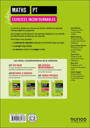 Vous avez besoin d’accompagnement pour appliquer votre cours de mathématiques du programme de PT ? Vous voulez être à l’aise face à tout exercice ? La clef de la réussite est de bien maîtriser les exercicesincontournables du programme. Cet ouvrage vous fait découvrir ces exercices et vous dévoile leurs méthodes de résolution. Pour chaque exercice, vous trouverez : • La méthode de résolution expliquée et commentée étape par étape. • Le corrigé détaillé rédigé. • Les astuces à retenir et les pièges à éviter.