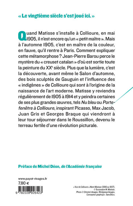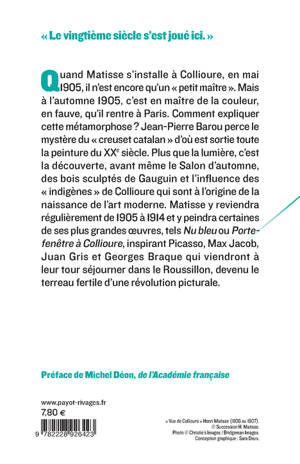 Quand Matisse s'installe à Collioure, en mai 1905, il n'est encore qu'un « petit maître ». Mais à l'automne 1905, c'est en maître de la couleur, en fauve, qu'il rentre à Paris. Comment expliquer cette métamorphose ? Jean-Pierre Barou perce le mystère du « creuset catalan » d'où est sortie toute la peinture du xxe siècle. Plus que la lumière, c'est la découverte, avant même le Salon d'automne, des bois sculptés de Gauguin et l'influence des « indigènes » de Collioure qui sont à l'origine de la naissance de l'art moderne. Matisse y reviendra régulièrement de 1905 à 1914 et y peindra certaines de ses plus grandes oeuvres, tel «Nu bleu »ou «Porte-fenêtre à Collioure», inspirant Picasso, Max Jacob, Juan Gris et Georges Braque qui viendront à leur tour séjourner dans le Roussillon, devenu le terreau fertile d'une révolution picturale.