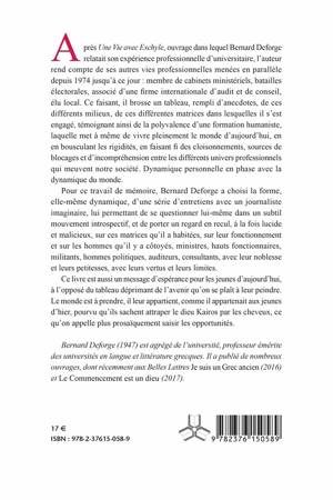 Après Une Vie avec Eschyle, ouvrage dans lequel Bernard Deforge relatait son expérience professionnelle d’universitaire, l’auteur rend compte de ses autres vies professionnelles menées en parallèle depuis 1974 jusqu’à ce jour : membre de cabinets ministériels, batailles électorales, associé d’une firme internationale d’audit et de conseil, élu local. Ce faisant, il brosse un tableau, rempli d’anecdotes, de ces différents milieux, de ces différentes matrices dans lesquelles il s’est engagé, témoignant ainsi de la polyvalence d’une formation humaniste, laquelle met à même de vivre pleinement le monde d’aujourd’hui, en en bousculant les rigidités, en faisant fi des cloisonnements, sources de blocages et d’incompréhension entre les différents univers professionnels qui meuvent notre société. Dynamique personnelle en phase avec la dynamique du monde. Pour ce travail de mémoire, Bernard Deforge a choisi la forme, elle-même dynamique, d’une série d’entretiens avec un journaliste imaginaire, lui permettant de se questionner lui-même dans un subtil mouvement introspectif, et de porter un regard en recul, à la fois lucide et malicieux, sur ces matrices qu’il a habitées, sur leur fonctionnement et sur les hommes qu’il y a côtoyés, ministres, hauts fonctionnaires, militants, hommes politiques, auditeurs, consultants, avec leur noblesse et leurs petitesses, avec leurs vertus et leurs limites. Ce livre est aussi un message d’espérance pour les jeunes d’aujourd’hui, à l’opposé du tableau déprimant de l’avenir qu’on se plaît à leur peindre. Le monde est à prendre, il leur appartient, comme il appartenait aux jeunes d’hier, pourvu qu’ils sachent attraper le dieu Kairos par les cheveux, ce qu’on appelle plus prosaïquement saisir les opportunités.