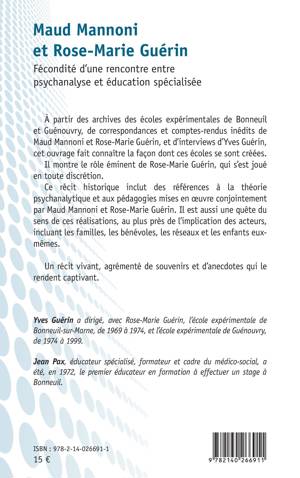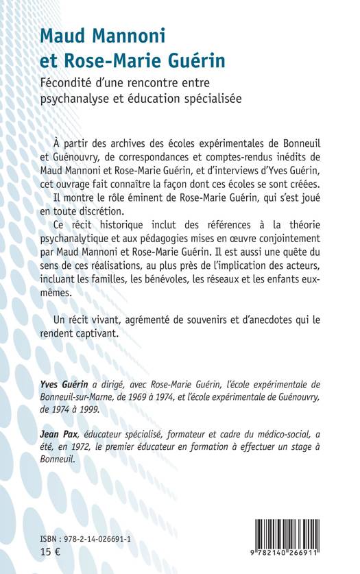 À partir des archives des écoles expérimentales de Bonneuil et Guénouvry, de correspondances et comptes-rendus inédits de Maud Mannoni et Rose-Marie Guérin, et d'interviews d'Yves Guérin, cet ouvrage fait connaître la façon dont ces écoles se sont créées. Il montre le rôle éminent de Rose-Marie Guérin, qui s'est joué en toute discrétion. Ce récit historique inclut des références à la théorie psychanalytique et aux pédagogies mises en oeuvre conjointement par Maud Mannoni et Rose-Marie Guérin. Il est aussi une quête du sens de ces réalisations, au plus près de l'implication des acteurs, incluant les familles, les bénévoles, les réseaux et les enfants eux-mêmes. Un récit vivant, agrémenté de souvenirs et d'anecdotes qui le rendent captivant.
