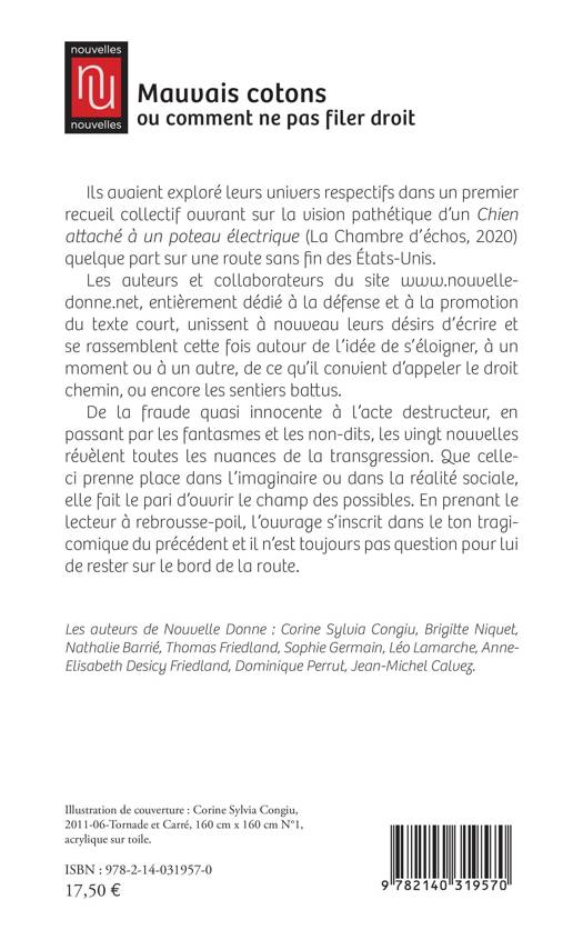 Ils avaient exploré leurs univers respectifs dans un premier recueil collectif ouvrant sur la vision pathétique d'un Chien attaché à un poteau électrique (La Chambre d'échos, 2020) quelque part sur une route sans fin des États-Unis. Les auteurs et collaborateurs du site www.nouvelledonne. net, entièrement dédié à la défense et à la promotion du texte court, unissent à nouveau leurs désirs d'écrire et se rassemblent cette fois autour de l'idée de s'éloigner, à un moment ou à un autre, de ce qu'il convient d'appeler le droit chemin, ou encore les sentiers battus. De la fraude quasi innocente à l'acte destructeur, en passant par les fantasmes et les non-dits, les vingt nouvelles révèlent toutes les nuances de la transgression. Que celleci prenne place dans l'imaginaire ou dans la réalité sociale, elle fait le pari d'ouvrir le champ des possibles. En prenant le lecteur à rebrousse-poil, l'ouvrage s'inscrit dans le ton tragicomique du précédent et il n'est toujours pas question pour lui de rester sur le bord de la route.