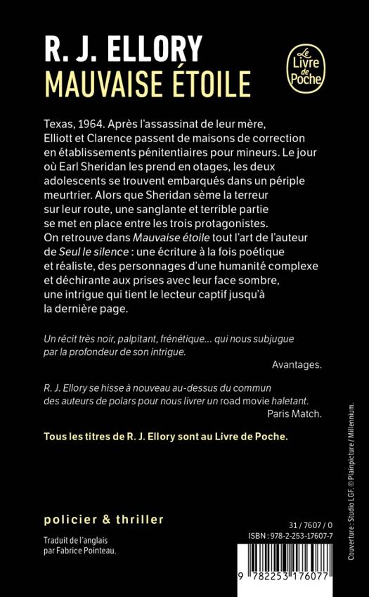 Texas, 1964. Après l'assassinat de leur mère, Elliott et Clarence passent de maisons de correction en établissements pénitentiaires pour mineurs. Le jour où Earl Sheridan les prend en otages, les deux adolescents se trouvent embarqués dans un périple meurtrier. Alors que Sheridan sème la terreur sur leur route, une sanglante et terrible partie se met en place entre les trois protagonistes. On retrouve dans Mauvaise étoile tout l'art de l'auteur de Seul le silence : une écriture à la fois poétique et réaliste, des personnages d'une humanité complexe et déchirante aux prises avec leur face sombre, une intrigue qui tient le lecteur captif jusqu'à la dernière page.