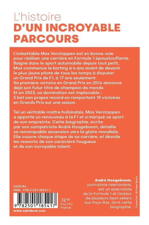 L’imbattable Max Verstappen est en bonne voie pour réaliser une carrière en Formule 1 époustouflante. Baigné dans le sport automobile depuis tout petit, Max commence le karting à 4 ans avant de devenir le plus jeune pilote de tous les temps à disputer un Grand Prix de F1, à 17 ans seulement. Sa première victoire en Grand Prix en 2016 annonce déjà son futur titre de champion de monde. Et en 2023, sa domination est implacable : il bat son propre record en remportant 19 victoires en Grands Prix sur une saison. Tel un véritable maître hollandais, Max Verstappen a apporté un renouveau à la F1 et a marqué ce sport de son empreinte. Cette biographie, écrite par son compatriote André Hoogeboom, détaille sa remarquable ascension vers la gloire mondiale. Elle couvre chaque étape de sa carrière, et dévoile les ressorts de son caractère fougueux et de son incroyable talent.