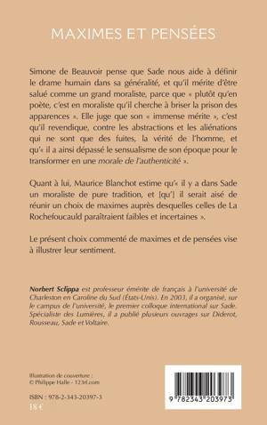 Simone de Beauvoir pense que le marquis de Sade nous aide à définir le drame humain dans sa généralité, et qu'il mérite d'être salué comme un grand moraliste, parce que « plutôt qu'en poète, c'est en moraliste qu'il cherche à briser la prison des apparences ». Quant à lui, Maurice Blanchot estime qu'« il y a dans Sade un moraliste de pure tradition, et [qu'] il serait aisé de réunir un choix de maximes auprès desquelles celles de La Rochefoucauld paraîtraient faibles et incertaines ». Le présent choix commenté de maximes et de pensées vise à illustrer leur sentiment.