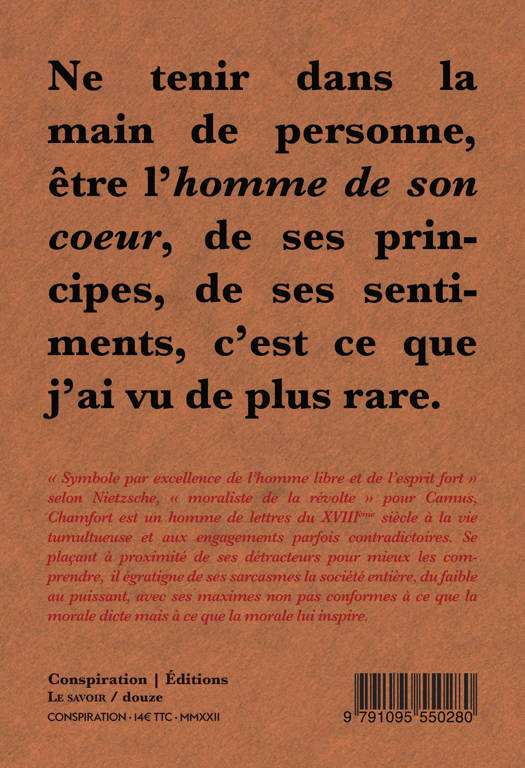 L'Åuvre la plus célèbre et lue de Chamfort a été publiée en 1795 par son ami Pierre-Louis Ginguené d’après les notes manuscrites laissée par l’auteur. Celui-ci y égratigne de ces sarcasmes la société entière, du faible au puissant. Ses maximes ne sont pas une liste de prescriptions morales. Son aptitude à penser contre lui-même de façon presque systématique, son aversion à l’injustice, sa volonté d’être au plus proche de ceux qui le persécutent ont permis à Chamfort d’écrire ces maximes très peu conformes à ce que la morale dicte mais tout à fait conformes à ce que la morale lui inspire. « Un homme se devrait de ne jamais se donner des principes plus forts que son caractère. » Des réflexions d’une grande puissance, qui n’ont pas pris une ride.