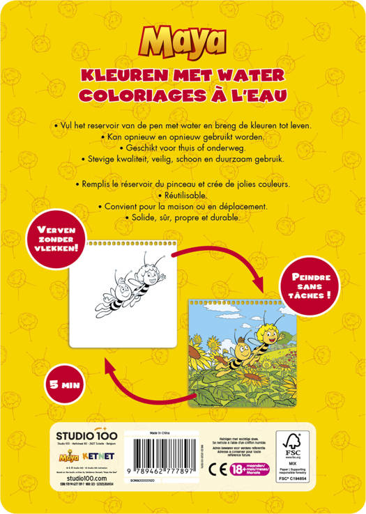 Het Maya de Bij Magisch Waterkleurboek bevat herbruikbare kleurplaten en een waterpen. Kleuren verschijnen vanzelf bij aanraking met water. Geschikt voor kinderen vanaf 18 maanden. Ideaal voor creatief speelplezier zonder geknoei.