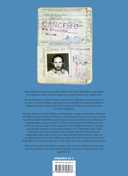 Steve McCurry was op 11 september 2001 in New York. Manhattan is zijn eiland, zijn thuishaven tussen twee reportages aan de andere kant van de aardbol door. De tweelingtorens stonden centraal in zijn uitzicht. Hij heeft ze zien instorten, uit de verte, en heeft vervolgens dagenlang van heel dichtbij foto’s gemaakt, zonder te begrijpen. In zijn opnames heeft hij de wonden en littekens van de stad en zijn bewoners vastgelegd. Veertien jaar later was hij in Parijs op de dag dat de aanslagen op het Stade de France en de Bataclan plaatsvonden. Kort daarna ontstond het plan om het leven van deze door zijn werk inmiddels wereldberoemde fotograaf te gaan vertellen in een combinatie van striptekeningen, teksten en foto’s. De Franse scenarist Jean-David Morvan en de Koreaanse tekenaar Jung Gi Kim maakten er een verbluffend verhaal van, dat zich aanvankelijk concentreert op de gebeurtenissen van 11 september, maar al snel uitwaaiert naar de fascinerende andere avonturen die Steve McCurry heeft meegemaakt tijdens zijn carrière. Zo is McCurry bijvoorbeeld ook de maker van de legendarische foto van het Afghaanse meisje, dat via de voorkant van National Geographic de wereld over ging, en van vele andere foto’s van mondiale gebeurtenissen. Dit boek bevat 64 in het verhaal verwerkte foto’s van Steve McCurry en daarnaast nog een portfolio van 12 foto’s op groot formaat, waarvan er 8 nog niet eerder zijn gepubliceerd.