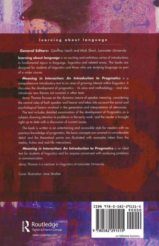 This introduction considers the development of pragmatics as a subject, drawing attention to problems in the early work, and bringing the reader up to date with a discussion of current issues. Basic concepts are covered in considerable detail and the theoretical points are illustrated with examples taken from the media, fiction and real-life interactions. Jenny Thomas focuses on the central roles of both speaker and hearer in the construction of meaning and takes account of both social and psychological factors in the generation and interpretation of utterances.