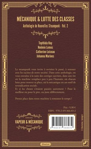 Quatrième de couverture : « Le steampunk vous invite à revisiter le passé, à renouer avec les racines de notre société. Dans cette anthologie, on vous entraîne à la suite des cortèges ouvriers, dans une ère où la machine remplace peu à peu l’humain, où chacun lutte pour trouver sa place, où la mécanique est un outil de revendication sociale. Et si les choses s’étaient passées autrement ? Pour le meilleur ou pour le pire, ou juste différemment. Prenez place dans notre machine à remonter le temps ! »