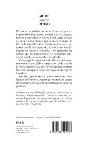 L'histoire de Médée est celle d'une vengeance impitoyable. Pour Jason, Médée a trahi son père, tué son propre frère et connu l'exil. Mais lorsque celui-ci nie leur amour pour épouser Créüse, la fille de l'inflexible Créon, Médée sombre dans une fureur sans limite. Apatride, abandonnée, elle lui impose en réponse la douleur - en égorgeant les enfants qui les unissaient. Et se condamne elle- même au plus insoutenable des deuils. Cette tragédie est ici suivie de "Thyeste" mettant en scène une autre célèbre vengeance : celle d'Atrée le furieux qui servira à son frère ses propres enfants lors d'un banquet à Argos sur laquelle ils règnent tous deux. Ces deux pièces sont ici présentées dans la traduction de Florence Dupont qui restitue à la langue de Sénèque toute sa clarté spectaculaire et sa fureur poétique.