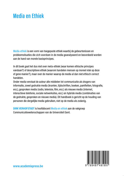 In dit boek gaat het dus niet over meta-ethiek (waar komen ethische principes vandaan?) of descriptieve ethiek (waarom handelen mensen op moreel vlak op deze of gene manier?), maar over de manier waarop de media al dan niet ethisch correct handelen. Onder media verstaat de auteur alle middelen tot communicatie als dragers van informatie, zowel gedrukte media (kranten, tijdschriften, boeken, pamfletten, fotografie, enz.), gesproken media (radio, televisie, film, enz.) als nieuwe media (internet, interactieve telefonie, sociale netwerksites, enz.) en hybride media (combinaties van de gedrukte, gesproken en nieuwe media). Dit handboek is gericht op de houding van personen die dergelijke media gebruiken, niet op de media als zodanig.