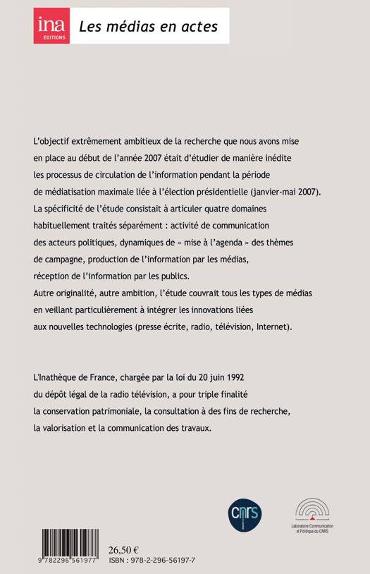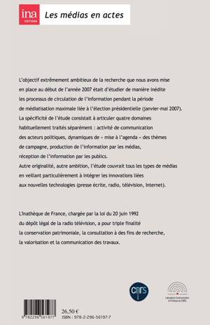 Ce livre étudie les processus de circulation de l'information pendant la période de médiatisation maximale liée à l'élection présidentielle (janvier-mai 2007) et s'articule autour de quatre domaines : activité de communication des acteurs politiques, dynamique de "mise à l'agenda" des thèmes de campagne, production de l'information par les médias, réception de l'information par les publics. L'étude couvre tous les types de médias (presse écrite, radio, TV, internet).