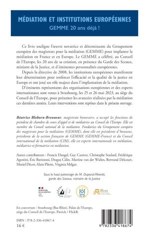Ce livre souligne l’œuvre novatrice et déterminante du Groupement européen des magistrats pour la médiation (GEMME) pour implanter la médiation en France et en Europe. Le GEMME a célébré, au Conseil de l’Europe, les 20 ans de sa création, en présence du Garde des Sceaux, ministre de la Justice, et d’éminentes personnalités européennes. Depuis la directive de 2008, les institutions européennes manifestent leur détermination pour renforcer l’efficacité et la qualité de la justice en Europe et ont joué un rôle majeur dans l’implantation de la médiation. D’éminents représentants des organisations européennes et des experts internationaux sont venus à Strasbourg, les 25 et 26 mai 2023, au siège du Conseil de l’Europe, pour présenter les avancées réalisées par la médiation ces dernières années. Leurs interventions sont reprises dans le présent ouvrage.