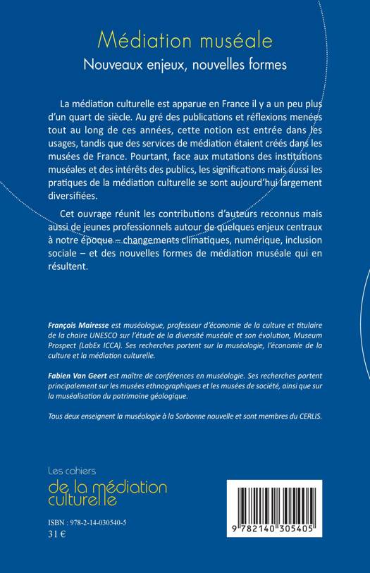 La médiation culturelle est apparue en France il y a un peu plus d'un quart de siècle. Au gré des publications et réflexions menées tout au long de ces années, cette notion est entrée dans les usages, tandis que des services de médiation étaient créés dans les musées de France. Pourtant, face aux mutations des institutions muséales et des intérêts des publics, les significations mais aussi les pratiques de la médiation culturelle se sont aujourd'hui largement diversifiées. Cet ouvrage réunit les contributions d'auteurs reconnus mais aussi de jeunes professionnels autour de quelques enjeux centraux à notre époque – changements climatiques, numérique, inclusion sociale – et des nouvelles formes de médiation muséale qui en résultent.