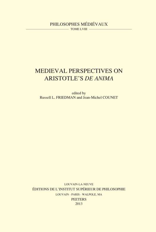 A majority of the various contributions gathered in this collection result from a Colloquium entitled "Soul and Intellect: Ancient and Medieval Perspective on the De Anima", which was held in Leuven and Louvain-la-Neuve (Belgium) from February 14th to 17th 2007, to celebrate the 50th anniversary of the foundation of the Centre De Wulf-Mansion. For reasons of convenience, the contributions relating to Antiquity and those relating to the Middle Ages are the subject of two distinct publications. This volume gathers a series of articles treating various aspects of the reception of the De Anima in the Middle Ages (and even in the Renaissance), from Averroes to Suarez. This volume should thus be regarded as the continuation of the work Ancient Perspectives on Aristotle's De Anima, ed. by G. Van Riel and P. Destree, with the assistance of C. Crawford and L. Van Campe (Ancient and Medieval Philosophy, XLI), Leuven, Leuven University Press, 2010. The contributors are R. Taylor, P. Porro, B. Goehring, T. Hoffmann, J. Casteigt, J. Aertsen, J.-L. Solere, W. Goris, P. Bakker, M. Abraham, S. de Boer, D. Perler, Ch. Shields.