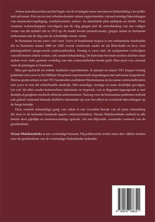 Artsen introduceerden aan het begin van de twintigste eeuw een nieuwe behandeling van syfilis: met salvarsan. Een succes met schaduwkanten: artsen rapporteerden vrij snel ernstige bijwerkingen van arsenicumvergiftiging, weefselversterf, zenuw- en nierschade plus epilepsie en sterfte. Waar westerse wetenschappers vervolgens aan de slag gingen met de ontwikkeling van een veiliger versie van dit middel dat in 1912 op de markt kwam (neosalvarsan), gingen artsen in Suriname enthousiast aan de slag met de schadelijke eerste versie. In Suriname kwam yaws veel voor. Yaws of framboesia tropica is een endemische huidziekte die in Suriname tussen 1880 en 1920 vooral voorkwam onder de uit Brits-Indië en Java voor plantagearbeid aangevoerde contractarbeiders. Ernstig is yaws niet: de symptomen verdwijnen vanzelf binnen enkele weken, ook zonder behandeling. De koloniale bewindvoerders dachten daar anders over: ieder gemiste werkdag van een contractarbeider kostte geld. Hun inzet was cruciaal voor de plantages in Suriname. Men gaf opdracht tot enkele medische experimenten. In januari en maart 1911 kregen twintig patiënten met yaws in het Militair Hospitaal experimentele inspuitingen met salvarsan toegediend. Hierna spoten artsen in mei 1911 honderden analfabete Hindostaanse en Javaanse contractarbeiders met yaws in met dit achterhaalde medicijn. Met onnodige, ernstige en soms dodelijke gevolgen. Let wel: dit alles zonder betrouwbare informatie en inspraak, wat in flagrante tegenspraak is met destijds al gangbare medisch-ethische artsennormen. Nazorg voor die Surinaamse patiënten ontbrak ook geheel: niemand tekende derhalve informatie op over het effect en eventuele bijwerkingen op de lange termijn. Deze ronduit schandalige gang van zaken is een zoveelste bewijs van de pure minachting die men in de koloniën koesterde jegens contractarbeiders. Nizaar Makdoembaks onthult in alle details deze pijnlijke en mensonwaardige episode. Als een blijvende, zwerende voetnoot van de geschiedenis.