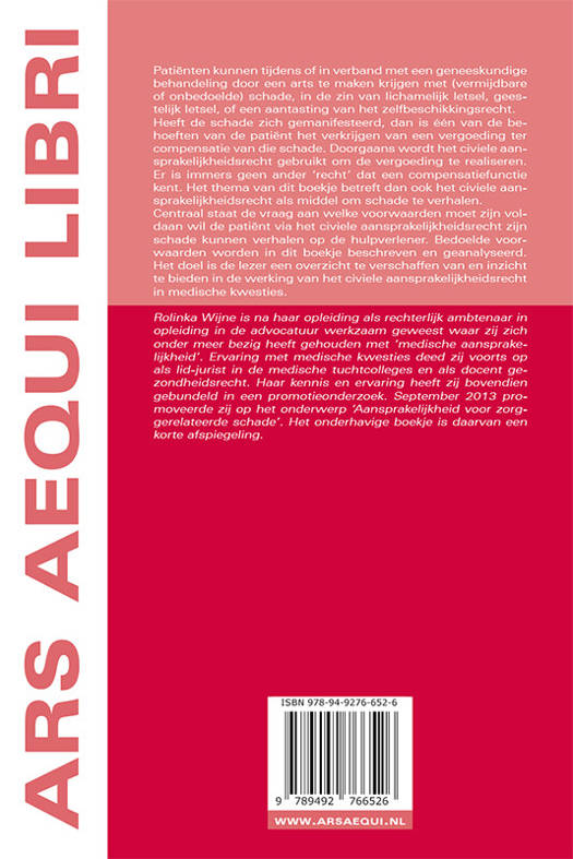 Rolinka Wijne is na haar opleiding als rechterlijk ambtenaar in opleiding in de advocatuur werkzaam geweest waar zij zich onder meer bezig heeft gehouden met ‘medische aansprakelijkheid’. Ervaring met medische kwesties deed zij voorts op als lid-jurist in de medische tuchtcolleges en als docent gezondheidsrecht. Haar kennis en ervaring heeft zij bovendien gebundeld in een promotieonderzoek. September 2013 promoveerde zij op het onderwerp ‘Aansprakelijkheid voor zorggerelateerde schade’. Het onderhavige boekje is daarvan een korte afspiegeling.