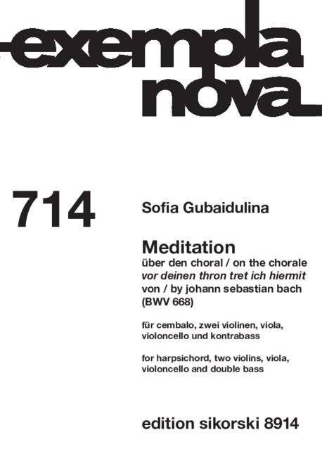 Drawing on her deep admiration for Johann Sebastian Bach, Sofia Gubaidulina has produced several works based on his music. For her Meditation on the Bach Chorale "Vor deinen Thron tret ich hiermit", she says she was guided by her personal experience of the inner numerical relationships in the formal structure of the chorale prelude BWV 668. In four sections, the piece for strings and harpsichord meditates on the tonal and numerical relationships within the Bach chorale until it is finally heard in its entirety and the harpsichord succinctly sets the final point with the tone sequence B-A-C-H. Instrumentation: harpsichord, 2 violins, viola, cello and double bass
