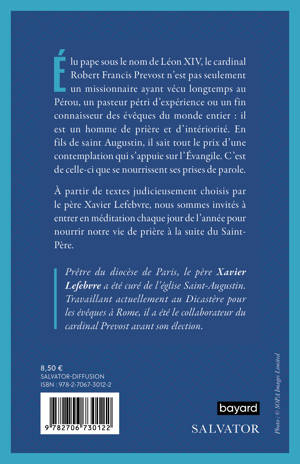 Élu pape le jeudi 8 mai sous le nom significatif de Léon XIV, le cardinal Robert Francis Prévost n'est pas seulement un missionnaire qui a vécu une longue partie de sa vie au Pérou, un évêque de terrain avec une forte expérience pastorale et un fin connaisseur des évêques du monde entier, c'est également un homme de prière et d'intériorité. En bon fils de saint Augustin, il sait tout le prix d'une prière fondée le sens de la Parole de Dieu et l'unité et consacre beaucoup de temps en en début de journée à la prière personnelle. À partir d'extraits de discours, d'homélies et de méditations judicieusement choisis, le père Xavier Lefebvre nous aide sur ce chemin prière proposé sur une année avec le pape Léon XIV.