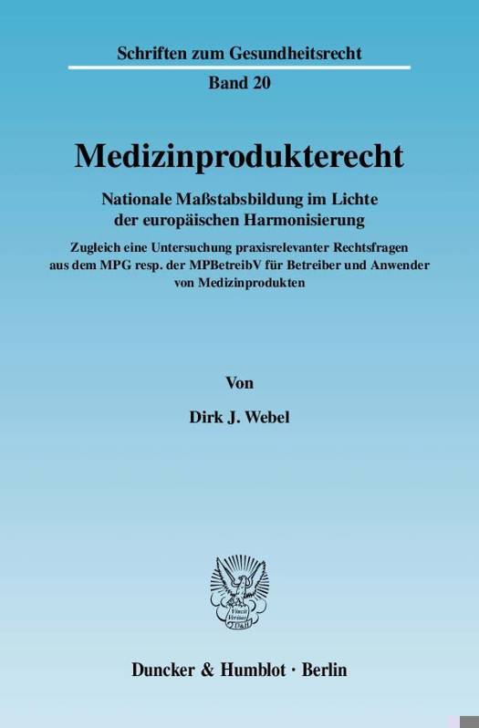 Dirk J. Webel setzt sich in der vorliegenden Arbeit das Ziel, die das Medizinprodukterecht prägenden Maßstäbe herauszuarbeiten, um sodann die zahlreichen Detailfragen der alltäglichen Praxis zu untersuchen. Dazu zählen etwa der Kernbegriff "Medizinprodukt" resp. die tradierten, noch immer intrikaten Abgrenzungsprobleme (Arzneimittel, Lebensmittel, Kosmetika etc.). Ungeachtet des RefE zum 3. MPG-ÄndG fehlt es auch noch immer an Legaldefinitionen für "Betreiber" und "Anwender". Der organisatorische Rahmen (Delegationsstrukturen, Verantwortlichkeitssphären) ist ebenso Gegenstand der Untersuchung wie die traditionellen Einzelprobleme, etwa die Einweisungsproblematik oder die Wiederaufbereitung von Einmalprodukten (resp. deren Folgen für die Aufklärung). Die Arbeit schließt mit einer Zusammenfassung der Ergebnisse und verschiedenen Nachbesserungsvorschlägen.
