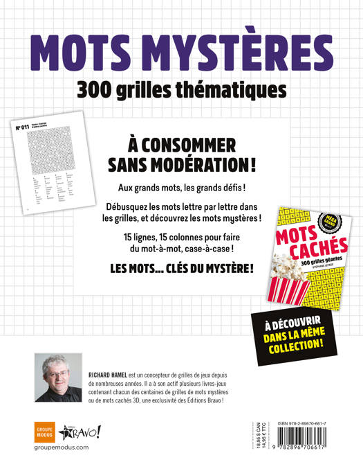 A consommer sans modération ! Aux grands mots, les grands défis ! Débusquez les mots lettre par lettre dans les grilles, et découvrez les mots mystères ! 15 lignes, 15 colonnes pour faire du mot-à-mot, case-à-case ! Les mots... clés du mystère !
