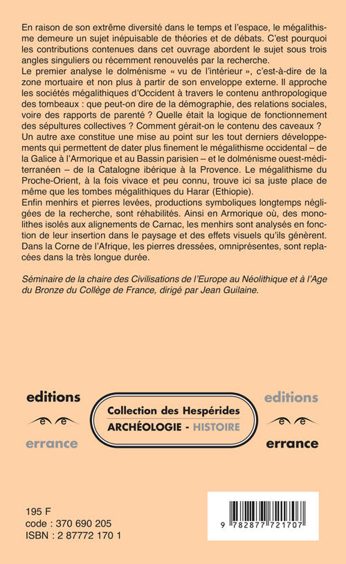 Aborde le sujet sous trois angles différents : approche des sociétés mégalithiques d'Occident à travers le contenu anthropologique des tombeaux, mise au point sur les tout derniers développements qui permettent de périodiser plus finement le mégalithisme occidental (ouest-méditerranéen) et proche-oriental, et, enfin, menhirs et pierres levées, longtemps négligés par la recherche, sont réhabilités.