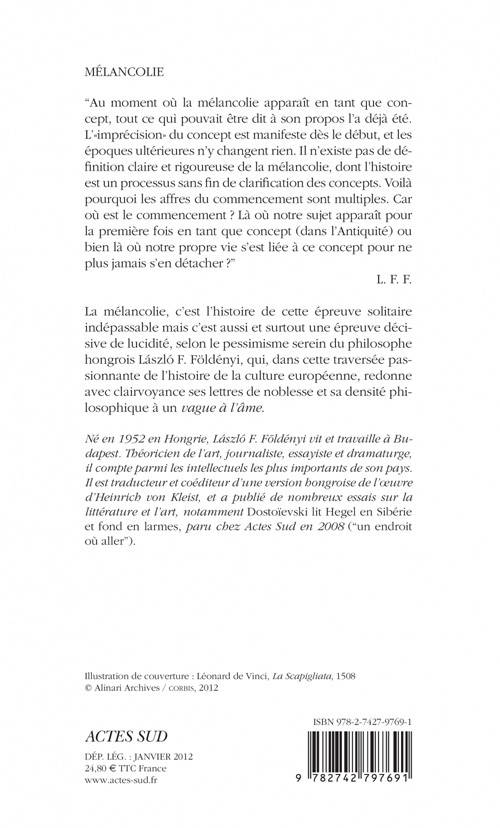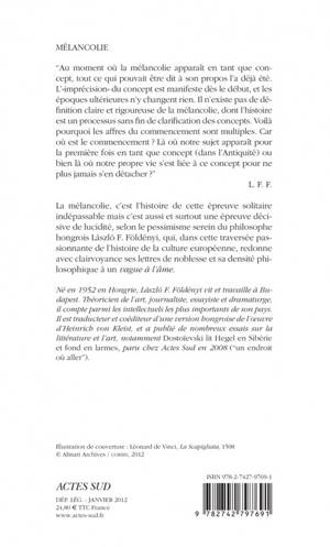 La mélancolie, c'est l'histoire de cette épreuve solitaire indépassable mais c'est aussi et surtout une épreuve décisive de lucidité, selon le pessimisme serein du philosophe hongrois László F. Földényi, qui, dans cette traversée passionnante de l'histoire de la culture européenne, redonne avec clairvoyance ses lettres de noblesse et sa densité philosophique à un «vague à l'âme.»