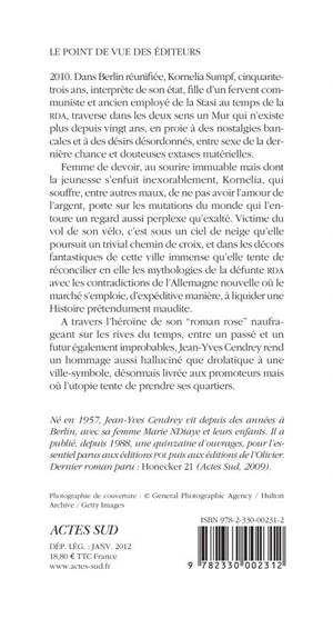 Femme de devoir, au sourire immuable mais dont la jeunesse s'enfuit inexorablement, Kornelia, qui souffre, entre autres maux, de ne pas avoir l'amour de l'argent, porte sur les mutations du monde qui l'entoure un regard aussi perplexe qu'exalté. Victime du vol de son vélo, c'est sous un ciel de neige qu'elle poursuit un trivial chemin de croix, et dans les décors fantastiques de cette ville immense qu'elle tente de réconcilier en elle les mythologies de la défunte RDA avec les contradictions de l'Allemagne nouvelle où le marché s'emploie, d'expéditive manière, à liquider une Histoire prétendument maudite.