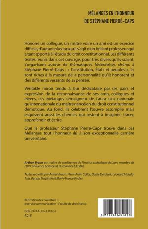 Honorer un collègue, un maître voire un ami est un exercice difficile, d'autant plus lorsqu'il s'agit d'un brillant professeur qui a tant apporté à l'étude du droit constitutionnel. Les différents textes réunis dans cet ouvrage, pour très divers qu'ils soient, s'organisent autour de thématiques fédératrices chères à Stéphane Pierré-Caps: Constitution, États et peuples . Ils sont riches à la mesure de la personnalité qu'ils honorent et des différents versants de sa pensée. Véritable miroir tendu à leur dédicataire par ses pairs et expression de la reconnaissance de ses amis, collègues et élèves, ces Mélanges témoignent de l'aura tant nationale qu'internationale du maître nancéien du droit constitutionnel démotique. Au fond, ils célèbrent l'oeuvre accomplie mais esquissent aussi les chemins qui restent à imaginer, tracer, approfondir et écrire. Que le professeur Stéphane Pierré-Caps trouve dans ces Mélanges tout l'honneur dû à son exceptionnelle carrière universitaire.