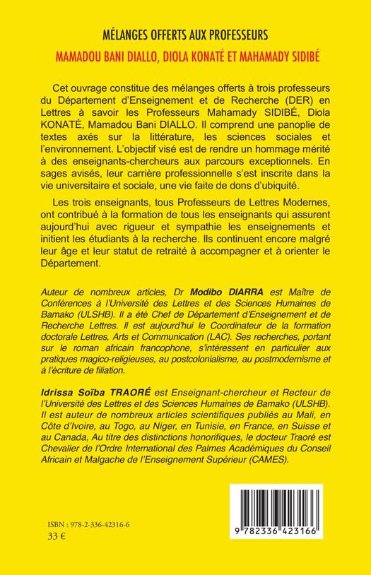 Cet ouvrage constitue des mélanges offerts à trois professeurs du Département d’Enseignement et de Recherche (DER) en Lettres à savoir les Professeurs Mahamady SIDIBÉ, Diola KONATÉ, Mamadou Bani DIALLO. Il comprend une panoplie de textes axés sur la littérature, les sciences sociales et l’environnement. L’objectif visé est de rendre un hommage mérité à des enseignants-chercheurs aux parcours exceptionnels. En sages avisés, leur carrière professionnelle s’est inscrite dans la vie universitaire et sociale, une vie faite de dons d’ubiquité. Les trois enseignants, tous Professeurs de Lettres Modernes, ont contribué à la formation de tous les enseignants qui assurent aujourd’hui avec rigueur et sympathie les enseignements et initient les étudiants à la recherche. Ils continuent encore malgré leur âge et leur statut de retraité à accompagner et à orienter le Département.