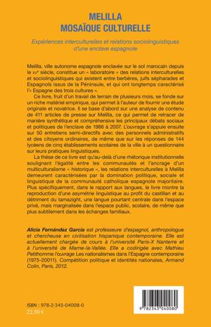 Melilla, enclave espagnole au Maroc, constitue un "laboratoire" des relations interculturelles et sociolinguistiques qui existent entre berbères, juifs sépharades et Espagnols issus de la Péninsule. La thèse de ce livre, qui s'appuie sur un travail de terrain, est que les relations interculturelles à Melilla demeurent caractérisées par la domination politique, sociale et linguistique de la communauté catholique espagnole majoritaire.