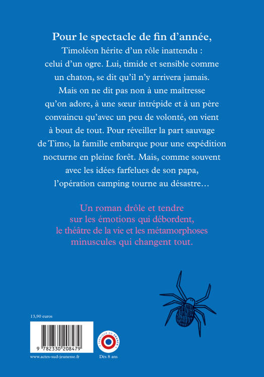 Pour le spectacle de fin d'année, Timoléon hérite d'un rôle inattendu : celui d'un ogre. Lui, timide et sensible comme un chaton, se dit qu'il n'y arrivera jamais. Mais on ne dit pas non à une maîtresse qu'on adore, à une soeur intrépide et à un père convaincu qu'avec un peu de volonté, on vient à bout de tout. Pour réveiller la part sauvage de Timo, la famille embarque pour une expédition nocturne en pleine forêt. Mais, comme souvent avec les idées farfelues de son papa, l'opération camping tourne au désastre... Un roman drôle et tendre sur les émotions qui débordent, le théâtre de la vie et les métamorphoses minuscules qui changent tout.